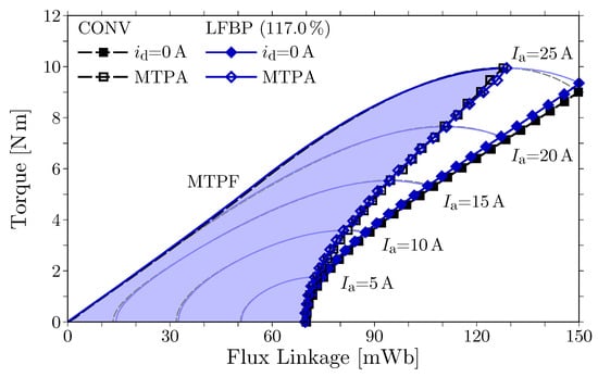 The variable leakage-flux characteristics are not effective for expanding the operating region in the CW motor LFBP. For motor drives over a wide range of torque and speed, motors should be operated to expand the operating region under an input current and voltage limit. The actual operating region of the motors CONV and LFBP is enclosed by the curve corresponding to the maximum torque per ampere (MTPA) operation, the curve corresponding to the maximum torque per flux-linkage (MTPF) operation, and the line for zero torque [], as shown in Figure 2c and Figure 3c. Here, the flux linkage of armature windings is substituted for the rotational speed to clarify the MTPF operation curve. Because the flux linkage is hardly dependent on the rotational speed, the operating regions shown in Figure 2c and Figure 3c are calculated at a rotational speed of . The MTPA operation maximizes torque for an input current. The MTPF operation maximizes torque for a given flux linkage under an input current limit. The zero d-axis current operation is not included in the actual operating region. Therefore, the efficacy of the variable leakage-flux characteristics is determined from the actual operating regions in this paper. Figure 4 shows the actual operating regions in the flux linkage and torque of the motors CONV and LFBP. The variable-flux characteristics can be compared for these motors by matching the maximum torque. The operating region of LFBP is enlarged to to match the maximum torque with the motor CONV at an armature current of . This enlargement corresponds to the increase in the stack length from to in the machine design in LFBP. The actual operating regions of these motors appear in an almost identical area. Thus, the variable leakage-flux characteristics are not effective for expanding the actual operating region in the CW motor LFBP in spite of the large increased ratio of the d-axis flux linkage to the q-axis current.