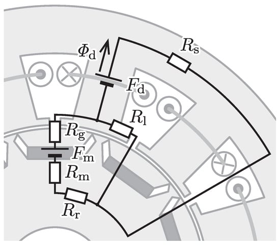 Magnetic saturation is appropriately induced in stator cores to enhance variable-flux characteristics. The variable leakage-flux characteristics achieve variable-flux characteristics by passively controlling flux through magnetic circuits that consist of rotor magnets, stator windings, and cores with magnetic saturation. The variable leakage-flux characteristics in distributed winding configurations are achieved through magnetic saturation in rotor cores [,,]. Therefore, variable-flux characteristics similar to the variable leakage-flux characteristics in distributed winding configurations can be achieved through magnetic saturation in stator cores. Based on the concept, a CW motor, designated as PROP, is proposed, as shown in Figure 1c, to achieve variable-flux characteristics induced by magnetic saturation. The stator core of the motor has tooth tips that are thin from the base to the end for inducing magnetic saturation. The stator slot opening is narrower than that of CONV. Hence, the width of stator tooth tips is wider than that of CONV to establish magnetic paths for the leakage flux of PMs in the stator. The stator tooth tips saturated magnetically suppresses the leakage flux of PMs and increases the d-axis flux due to PMs. The variation in the d-axis flux due to PMs can be confirmed with a conceptual magnetic circuit, as shown in Figure 6. The magnetic circuit focuses a part of the d-axis magnetic circuit that is most strongly affected by magnetic saturation. In the figure, the rotor rotates in a counterclockwise direction. Magnetic saturation shifts to the adjacent stator teeth in the clockwise direction as the rotor rotates. Therefore, similar magnetic saturation persists with the rotation of the motor.The PMs are modeled as the series-connected magnetomotive force and magnetic reluctance . The d-axis winding current produces the magnetomotive force . The magnetic reluctances of the air gap, stator core, and rotor core are denoted as , , and , respectively. In particular, the magnetic reluctance of the stator tooth tip, in which magnetic saturation appears, is expressed as . The d-axis flux due to the PMs corresponds to the flux at . The flux can be obtained from the magnetic circuit as