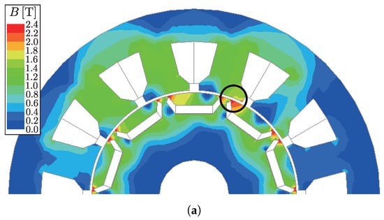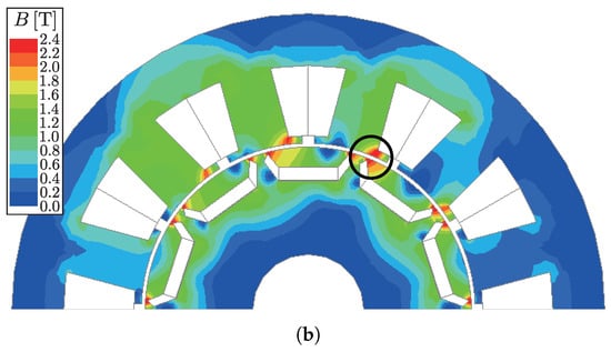Figure 7 shows the distribution of magnetic flux density in the MTPA operation with and in CONV and in PROP. The rotor shows a similar distribution of magnetic saturation. On the other hand, the distribution of magnetic saturation is different in the stators. In the stator of CONV, magnetic saturation rarely appears, as shown in Figure 7a. In the stator of PROP, magnetic saturation appears prominently in the bases of the stator tooth tips, as shown in Figure 7b. In particular, magnetic saturation at the stator and the rotor blocks the magnetic path in the circle of Figure 7b. The blocked magnetic path corresponds to the magnetic reluctance in the magnetic circuit shown in Figure 6. Therefore, the influence of magnetic saturation on the magnetic circuit is confirmed with the FEM analysis.
