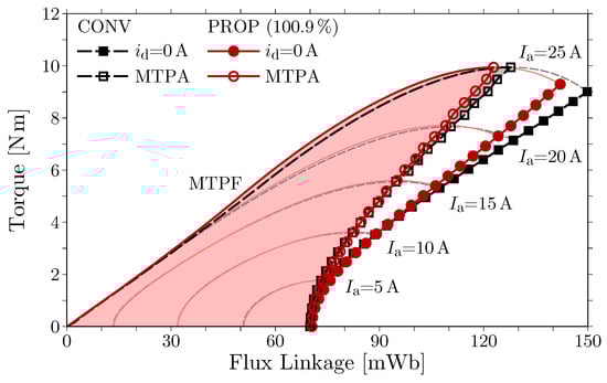 Figure 8c shows the actual operating region, which is enclosed by the curve corresponding to the MTPA operation, the curve corresponding to the MTPF operation, and the line for zero torque at a rotational speed of . Figure 9 shows the actual operating regions in motors CONV and PROP. Here, the motor CONV is selected for the comparison because the motor CONV has an identical rotor structure with PROP and exhibits an almost identical operating region to that of LFBP, whose stack length is increased. The region of PROP is enlarged to to match the maximum torque at an armature current of . This enlargement corresponds to the increase in the stack length from to in the machine design. The actual operating region of PROP appears in the area with lower flux linkage than that of CONV. Hence, the motor PROP produces an identical torque with lower flux linkage or lower EMF than CONV. At the maximum armature current in the MTPA operation, the flux linkage decreases with the proposed stator by approximately . The proposed stator expands the operating region toward a high speed range. Therefore, the motor PROP exhibits more effective variable-flux characteristics than CONV.