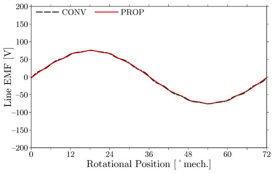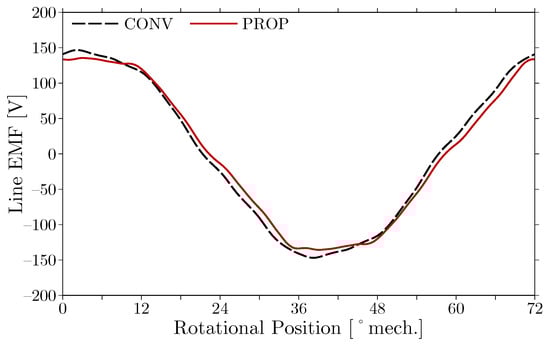 No-load line EMF at a rotational speed of in CONV and PROP.