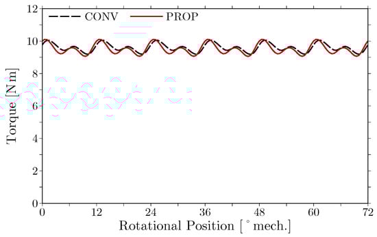 Torque production is slightly affected by the proposed stator. Figure 12 shows the waveforms of torques in the MTPA operation in CONV and PROP at an armature current of . The average torques are in CONV and in PROP. The proposed stator decreases the average torque in the MTPA operation by approximately . The torque ripple is slightly increased by the proposed stator. This is caused by the increased width of the stator tooth tips in the proposed design. Therefore, the proposed stator produces an almost identical torque in spite of the active induction of magnetic saturation.