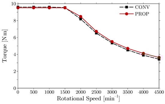 Maximum torque for rotational speed under the conditions of a maximum armature current of and a maximum line voltage of in CONV and PROP.