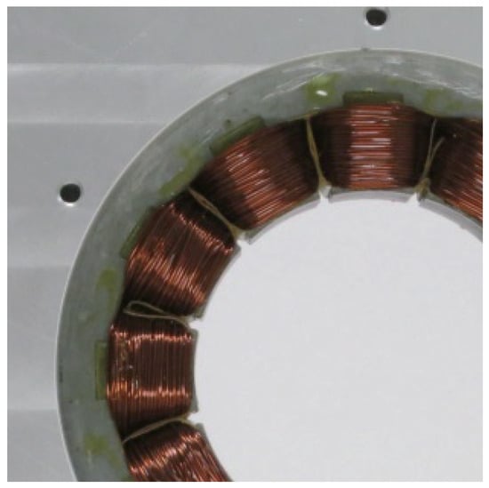 Fractional-slot concentrated winding (FSCW) configurations have attracted much attention with the aim to achieve lower cogging torque, lower copper loss, and shorter axial length design than integral-slot distributed winding configurations in PM motors [,,,,,,,]. In FSCW configurations, the magnetic field, due to the armature windings, includes several dominant space harmonics. One of them produces drive torque. The others give rise to undesirable effects that increase iron loss in cores and eddy-current loss in PMs without contributing to torque production [,,,,]. These dominant space harmonics induce magnetic saturation asymmetrically for each pole in rotor cores because of the different periodicities in the spatial distribution of the air-gap flux density.