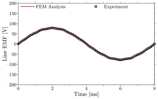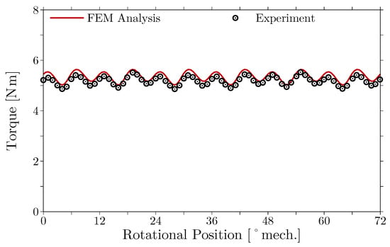Fundamental characteristics without magnetic saturation obtained with the FEM analysis is verified experimentally. No-load EMF has been measured by rotating the prototype with an induction motor at a rotational speed of . Figure 16 shows the waveform of the no-load line EMF. The waveform calculated through the FEM analysis is shown for comparison. The FEM analysis accurately predicts the actual no-load line EMF of the prototype. Static torque of the prototype has been measured at each rotor position at a q-axis current of . Figure 17 shows the measured torque with the torque calculated through the FEM analysis. The calculated torque coincides with the measured one.
