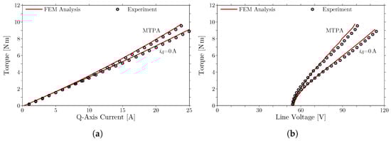 The variable-flux characteristics of the prototype are confirmed with the torque production and the induced voltage for armature current at a rotational speed of . Average torque of the prototype has been measured for armature current in the zero d-axis current operation and in the MTPA operation, as shown in Figure 18a. This figure includes the average torque calculated through the FEM analysis for comparison. In the FEM analysis, each indicated torque is obtained by subtracting a no-load torque from the corresponding electromagnetic torque because the FEM analysis cannot include the influence of the no-load torque. The no-load torque is estimated with the torque measured by rotating the prototype without armature current and the iron loss in cores and the eddy-current loss in PMs calculated through the FEM analysis at each rotational speed. The measured value of the no-load torque is at . The actual average torque can be predicted by the FEM analysis. The prototype can produce the maximum torque at the current phase predicted by the FEM analysis for each armature current. Average torque is associated with the line voltage for armature current in the zero d-axis current operation and in the MTPA operation, as shown in Figure 18b. The results calculated through the FEM analysis are shown for comparison. The line voltage is indicated as the effective or root-mean-squared value. The voltage drop across the armature winding is included in the line voltage. However, the FEM analysis cannot calculate the voltage corresponding to the iron loss in cores and the eddy-current loss in PMs. In addition, the influence of switching in an inverter for input is not included in the FEM analysis. For these reasons, the FEM analysis slightly underestimates the line voltage of the prototype. Therefore, the FEM analysis can predict the variable-flux characteristics of the prototype with a sufficient degree of accuracy.