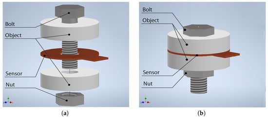 It should be noted here that inserting such sensor layers between the tightened objects must be done extremely carefully because the mechanical properties of the inserted layers, e.g., stiffness, strength, wear resistance, creep resistance, etc., may directly affect the quality of the joint, or even completely impair its functionality. In practice, the material selection for the sensor layer should be carried out thoughtfully, considering those mechanical properties. However, in order to focus only on the validation of the legitimacy of the above-mentioned concept of the proposed sensor, the appropriateness of the sensor materials in terms of those mechanical properties will not be addressed in this study.