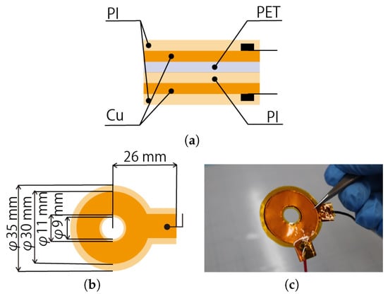 For experimental purposes, we determined specific dimensions of the sensor, as shown in Figure 2b, assuming an M8 bolt–nut system and tightened objects with a thickness of 8 mm made of structural steel (SS400). As described in Section 2.1, the material selection was carried out only focusing on the triboelectric performance without considering their mechanical properties as the joint insertion. We chose polyethylene terephthalate (PET) and polyimide (PI) films as the triboelectric layers, the former of which is to be positively charged while the latter is negative when brought into contact with the other. For the insulation layers, we chose polyimide (PI) films. The material and thickness of all layers are summarized in Table 1.