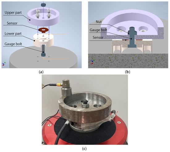 Experiments to examine the performance of the proposed sensor were conducted using an experimental setup consisting of a test assembly mounted on a shaker, as shown in Figure 3. The test assembly is composed of an upper and lower component jointed by a single M8 bolt–nut with a sensor, under test, inserted between them. The lower component is fixed on the shaker’s head with four M4 bolts to give the assembly a dynamic load in the vertical direction. The upper component has a crown-like shape to effectively give an inertial mass to produce an inertial force as an external dynamic tensile load when it is harmonically excited by the shaker. Thus, this assembly is designed to perform as a dynamically loaded tensile joint with a single bolt. On the joining surface of both components, a circle-shaped tab 1 mm in height with a diameter of 30 mm is machined to explicitly define the contact interface. The M8 bolt was a gauge bolt with a strain gauge embedded inside to measure the axial force of the bolt. In addition, an accelerometer was mounted on the upper component to monitor the acceleration applied to the test assembly.