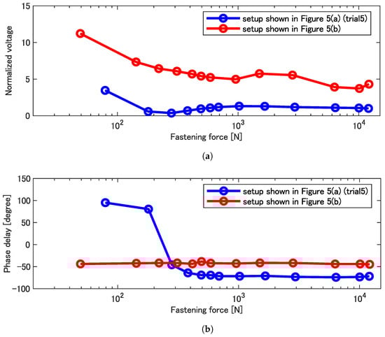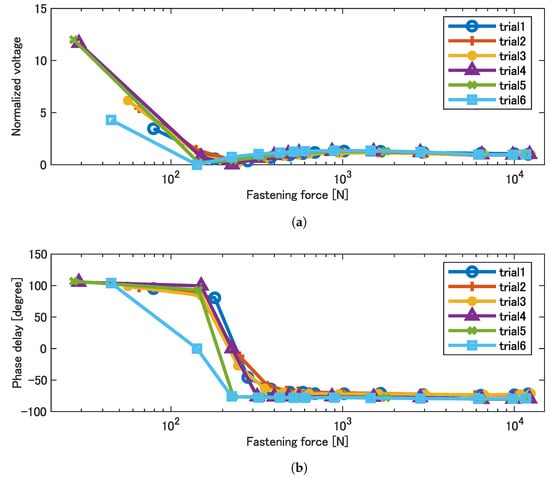 The results of the vibration tests, repeated six times, are plotted in Figure 4, where the absolute values of the 35 Hz component of the sensor output are plotted in Figure 4a against the axial force of the bolt, while the phase delays with respect to the excitation acceleration are shown in Figure 4b. Note that the sensor output was defined as the voltage of the upper triboelectric layer (PET) relative to the lower layer (PI) and normalized by the value for the maximum fastening condition to eliminate the difference in the variation in the voltage level among the trials.