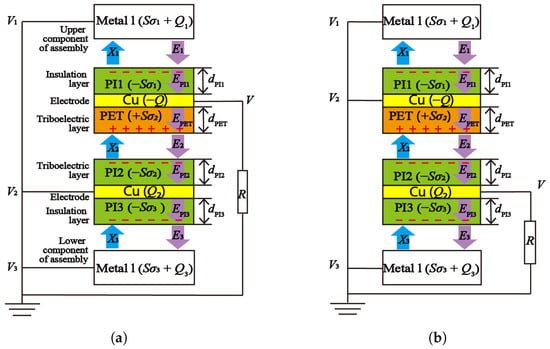 As shown in Figure 5a, the triboelectric charge density at the contact between the triboelectric layers (PET and PI2) is assumed to be , where PET is positively charged, while PI2 is negative. Similarly, and are assumed for the triboelectric charge density between Metal1 and PI1, and between PI3 and Metal2, respectively. Note that, for this metal–polymer contact, the metal layers are supposed to be positively charged. Also, air gaps between every contacted layer should be considered because the sensor is simply sandwiched between the fastened objects. The axial displacements of each air gap are assumed to be , , and , as indicated in the figure.