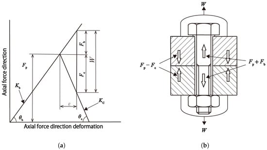 Let us first consider the forces and deflections in a bolted joint. When the bolt and nut are fastened, a tensile force (preload) is generated in the bolt and a compressive force (fastening force) of equal magnitude is generated between the fastened objects. This relationship is illustrated in Figure 7a, usually called a joint diagram [], in which is the spring constant of the bolt–nut system and is the spring constant of the fastened objects.