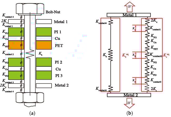 Figure 8a shows a model of the bolted joint with the proposed sensor, in which a contact stiffness denoted by is introduced between each contacting surface, and , , and are the spring constants of PI, PET, and the copper electrode, respectively. Note that the contact stiffness between the bolt sheet (or nut sheet) and the fastened object is involved in , and the others in , because the external load is applied on the fastened objects (labeled as Metal1 and Metal2), as depicted in Figure 8b. Then, the equivalent spring constants are calculated as series composite spring constants of these trains of spring elements as