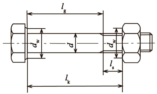 where d, , , , and are the dimensions of the bolts, which are defined in Figure 9, while , , , and denote the diameter of the bolt hole, effective cross-sectional area of the bolt, Young’s modulus of the bolt, and Young’s modulus of the fastened objects, respectively. All the values of those parameters used in the calculations are listed in Table 2.