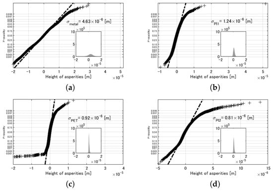 In order to evaluate the actual values of the contact stiffness according to Equation (26), the distribution of the heights of the asperities on each surface of the contacting materials was investigated. We measured the two-dimensional profile of each contacting surface with a laser microscope at three specific locations, and extracted the heights of the local summits from those profiles. Figure 10 shows the normal probability plot of the extracted heights for each surface, displayed with their histogram. From the plots, it was found that the main body of the right part of the distribution is fairly approximated by a Gaussian distribution except for the long right tail, which may contain measurement noise and outliers. Thus, we adopted the standardized normal density as in Equation (25) and calculated the stiffness of each contact interface by numerically evaluating Equations (25) and (26).