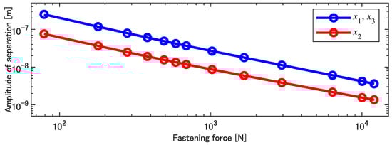Figure 11 shows the results of the calculation of the amplitude of the variation in the contact separation by Equations (27)–(29). Note that the contact stiffness and are assumed to be the same because both are the contact between the same Metal and PI, and thus are the calculated amplitudes of and . As presented in the figure, it is found that the contact separation amplitudes are almost inversely proportional to the fastening force, and they are on the order of m at most for the Metal–PI contact and m at most for the PET–PI contact within the experimental conditions.