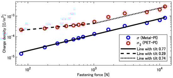 The results are plotted in Figure 12, in which regression lines being described below are also drawn. The triboelectric charge density that fits the experimental results increases as the fastening force increases, varying from the order of C/m to C/m for the Metal–PI contact and from C/m to C/m for the PET–PI contact. These values are reasonable, as the charge density reported in the literature related to TENG varies in the same range [,,,]. A closer look at the dependence of the estimated charge density on the fastening force reveals that the triboelectric charge density at the contact between Metal and PI is almost proportional to the fastening force, showing a slight saturating tendency at high loads, whereas the charge density between PET and PI exhibits a different power law at low loads.