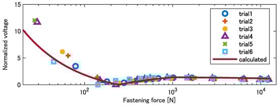 Finally, to verify that the mechanical–triboelectric model presented in this section, taking account of the tightening mechanics of the bolt and the contact mechanics of Metal–PI and PET–PI contacts, can appropriately explain the experimental results, the voltage amplitude of the sensor output for the initial configuration shown in Figure 5a was calculated based on the regression curves indicated in Figure 12. The result is shown in Figure 13 with a solid line accompanied by all the experimental data plotted by markers. As presented in the figure, the model curve has a valley at a location close to the valleys that the experimental data exhibited and shows a good agreement with the experimental results in wide range of the fastening force, except for the lowest load conditions. The relatively large error at the low fastening forces is probably due to the deviation of the initial contact condition under the loosest fastening force, as mentioned in Section 4.1. Introducing additional parameters to express the variation in triboelectric charge density considering the deviation of the real contact area in low load conditions may further improve the model adequacy.