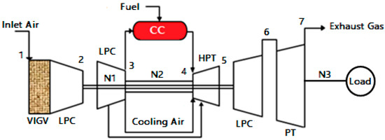 The Rolls-Royce RB211-24G three-shaft gas turbine which is manufactured by Rolls Rolls-Royce, Goodwood, England, is used as a case engine in this study. This gas turbine engine was developed by Rolls-Royce, a British engineering company known for its high-quality engines used in aerospace and other applications. The gas turbine engine is also called a high-pressure ratio engine. The gas generator has two spools (meaning two rotors), and its exhaust gases drive the power turbine. The secondary air taken from the gas generator compressors serve as cooling and sealing air. The gas turbine has six main gas-path components, including an intermediate-pressure compressor (IPC), a high-pressure compressor (HPC), a combustion chamber, a high-pressure turbine (HPT), an intermediate-pressure turbine (IPT), and a power turbine (PT) [25]. Three-shaft industrial gas turbine configurations are shown in Figure 1.