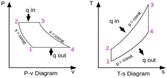 The laws of thermodynamics are always used to investigate gas turbine performance. An industrial gas turbine has a compressor, combustor, and turbine [26]. Furthermore, every open and closed-cycle power generation gas turbine works in four processes, which are: compression, combustion, expansion, and heat rejection [27]. Air is used as a medium of fluid for the gas turbine, and is compressed at the compressor, while combustion takes place at the combustor. The result of combustion gases will be then entered into the expander or turbines for production of power. Gas turbine systems work by the Brayton cycle principle [28]. The ideal Brayton cycle is defined as a thermodynamic cycle that consists of an isentropic and adiabatic compression of a gas, followed by an addition of heat at constant pressure and an energy extraction that results in gaseous expansion [26], as shown in Figure 2 below.