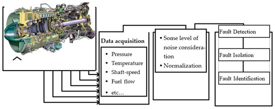Fault diagnosis is the process of identifying and determining the root cause of problems or faults that occur in a machine or system [29]. This process involves analyzing data and signals from various sensors, such as temperature sensors, vibration sensors, pressure sensors, and others, to detect anomalies or deviations from no-fault operating conditions. The goal of fault diagnosis is to quickly and accurately diagnose the problem in order to minimize downtime and reduce repair costs [30,31]. This can be accomplished by using various techniques, such as statistical analysis, machine learning, and artificial intelligence, to detect patterns and anomalies in the data. Fault diagnosis is, in general, the procedure of detecting, isolating, and identifying an impending or incipient failure condition, during which the affected component is still operational, though in a degraded mode [32]. Fault diagnosis is used in a variety of industries, including manufacturing, transportation, energy, and healthcare, where it plays a critical role in ensuring the safe and efficient operation of machines and systems [33]. The general engine diagnosis approach is shown in Figure 1.