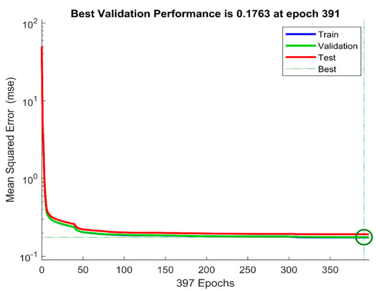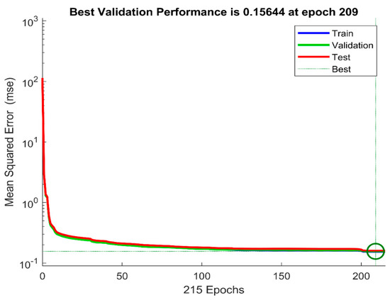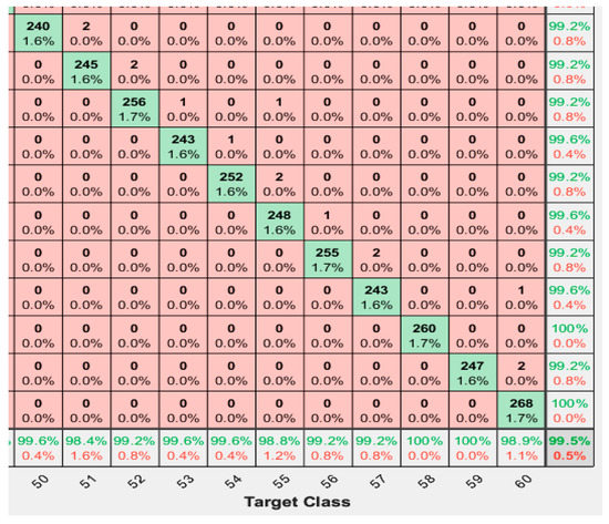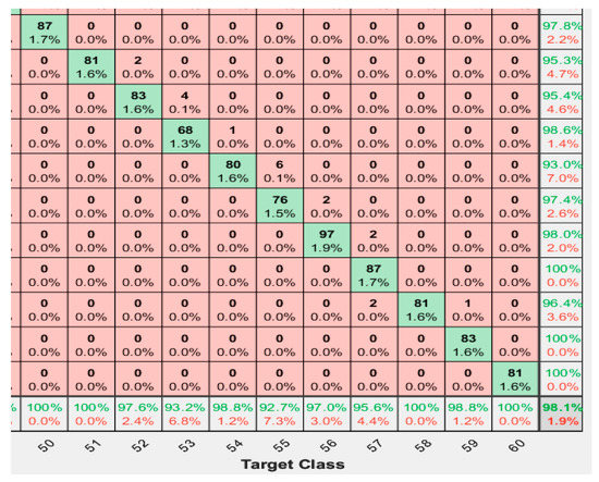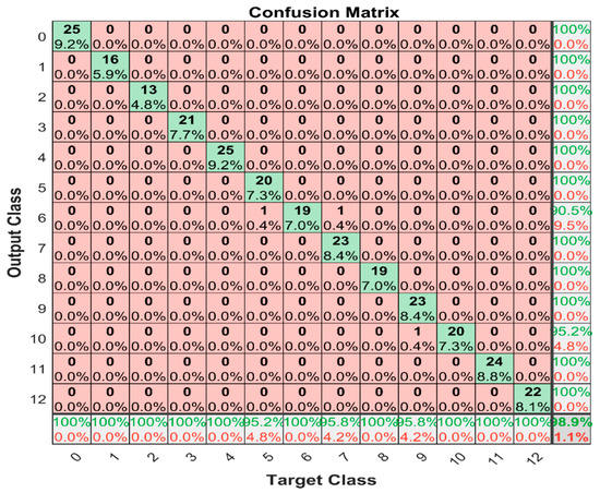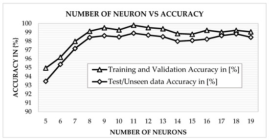 The narrow neural network outperformed better shown in Table 6 was taken as reference for further investigation to improve the network’s performance. This investigation involved simulating the model with different numbers of hidden layer neurons within a range of 5 to 19. Through this process, it was discovered that setting the network with 11 hidden layer neurons led to superior fault detection and isolation accuracy, particularly for single faults occurring at 100% load condition. In Figure 5, the number of neurons in the hidden layer versus the accuracy of single fault detection and isolation is shown, specifically focusing on the 100% load condition. This graph provides a comprehensive understanding of how the accuracy of fault detection and isolation fluctuates as the number of hidden layer neurons is adjusted. Figure 6 illustrates the network architecture with the inclusion of the 11 hidden layer neurons. The performance of the network was evaluated through training and validation, with the accuracy results depicted in Figure 7. Furthermore, the accuracy of the fault detection and isolation model was assessed using unseen or test data, and the results are presented in Figure 8.