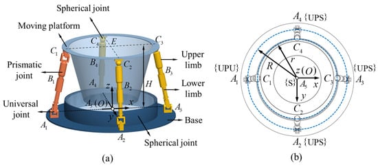 Geometry of the parallel mechanism: (a) structure in front view; (b) structure in top view.