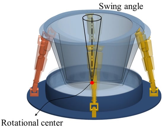 This parallel mechanism is designed based on a specified application. It is required to have two rotational degrees of freedom around the - and -axis as shown in Figure 1. The demanded swing angles of the moving platform, as illustrated in Figure 2 are 10°. As universal joints and spherical joints in kinematic chains have only a little effect on the workspace regarding the designated swing angles, the workspace is limited mainly by the effective length of subchains with the prismatic joints. The design of the chain length and the selection of prismatic joints are determined by the required swing angles.