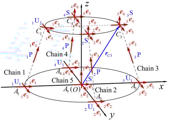 Figure 3 depicts the unit vector of all kinematic joints in each chain. As the velocities, positions, and postures of each joint are expressed in screw coordinates, the reciprocal screw theory is employed here to compute the mobility of this parallel mechanism. In accordance with the reciprocal screw theory, there is: