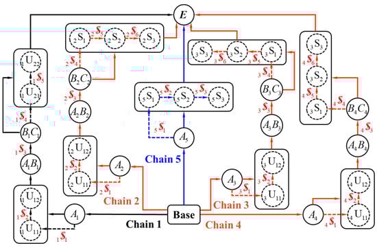 As the topological diagram illustrated in Figure 4, according to the given motion of the geometric center E on the outer ring of the moving platform , the velocity screws of the end effectors of each kinematic chain can be calculated by: