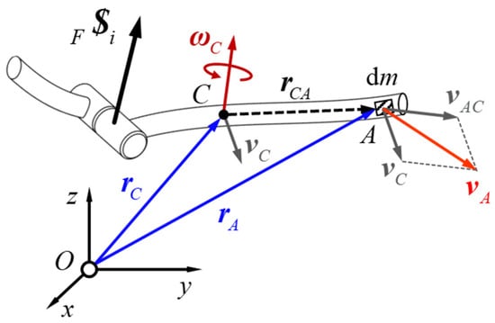 As illustrated in Figure 5, the mass center is chosen as the reference point of the rigid body , the velocity of point can be obtained through , and the velocity of body-fixed mass segment at point can be calculated by .