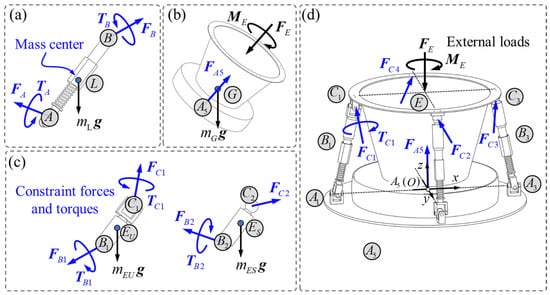 Dynamic analysis of the parallel mechanism. (a) Dynamics of the lower limbs of four subchains; (b) dynamics of the {S} chain; (c) dynamics of upper limbs of four subchains connecting with universal joint or spherical joints; (d) dynamics of the moving platform.