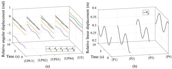 Figure 7a plots the relative angular displacements of each revolute joint in five kinematic subchains. Figure 7b shows the relative linear displacements of all prismatic pairs of four subchains surrounding the moving platform.