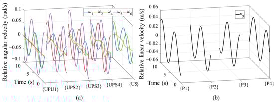 Figure 8a depicts the relative angular velocity of each revolute joint in parallel mechanism. Figure 8b shows the relative linear velocity of four active prismatic pairs in four {UPU} and {UPS} subchains. According to the simulation results, there are no unexpected sudden changes in velocities, and the motion of each joint shows a harmonious operation of the mechanism.
