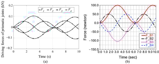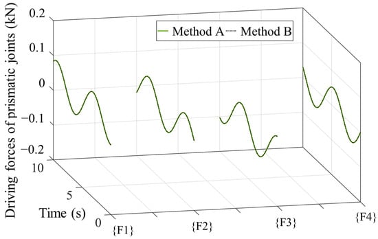 To validate the correctness of the modeling method proposed here, dynamic analysis modeling based on Newton–Euler equations is also established []. Method A represents the method using momentum screws and force screws proposed in this paper, and Method B is the method based on Newton–Euler equations. From Figure 9, the results of both methods are consistent, which indicates the correctness of both methods. Furthermore, a dynamic analysis is performed by commercial software, Adams. The kinematic parameters of the specified motion are defined in Adams simulation model, and the driving forces of four actuators in prismatic joints are analyzed. The results of numerical analysis through MATLAB shown in Figure 10a and the results of simulation through Adams shown in Figure 10b are comparable and have good consistency. The simulation model used in Adams is simplified, and the influence of step length on simulation results has different weights in MATLAB and Adams, which can result in differences between the results.