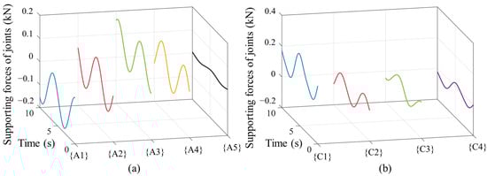 Besides all the driving forces, the support forces on each passive joint can be computed simultaneously. The forces exerted on universal joints assembled on the base at position and the spherical joint at position of the 5th kinematic chain are illustrated in Figure 11a. It shows that the four surrounding subchains withstand more forces than the chain {S}, which facilitates rotation of the spherical joint of chain {S} and allows for more stable motion overall. Figure 11b demonstrates the forces acting on universal joints at position and spherical joints . In the whole motion period, forces vary according to the motion, and there are no sudden changes in forces, which expresses a stable and robust support.