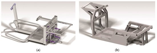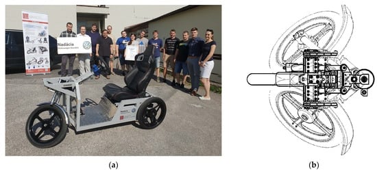 As part of its “Advancing Technology” grant scheme, the Volkswagen Foundation has provided support for a project that focuses on the structural design of a three-wheeled electric vehicle known as the E3-kolka. This innovative vehicle aims to improve passenger safety during cornering by employing mechanical principles (Figure 1a). The design, which has been patented [], is extensively discussed in the article []. While its primary application lies within the domain of road vehicles in the motorcycle industry, the design’s benefits extend to any scenario where enhanced stability of overall structures is required for the operation of three-wheeled vehicles.