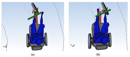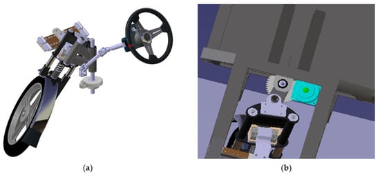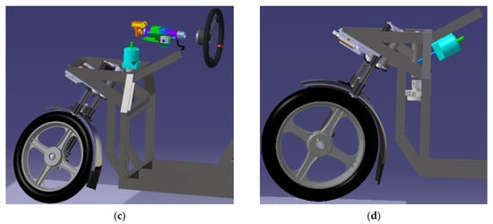 Based on the design modification depicted in Figure 4b, it is evident that this alteration will impose considerable constraints on the rotation of the steering console. Consequently, the maximum steering angle of the front wheel will be diminished during left turns, leading to an asymmetry in the wheel’s range of motion. Therefore, this solution cannot be considered suitable.
