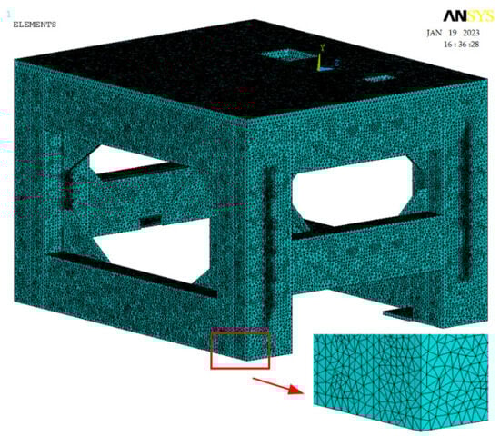 Based on the aforementioned facts, an important aspect in the structural design of the testing device for measuring the fatigue life of materials is the design of appropriate profiles for the supporting component, namely the frame. According to [], the frame will be subjected to cyclic motion generated by eccentric components driven by an electric motor equipped with a frequency converter ranging from 0 to 100 Hz. Therefore, it is crucial to design a robust frame capable of withstanding all frequencies within this range. It has been determined that the lowest natural (resonant) frequency of the frame should be approximately 1.2 times the excitation frequency (100 Hz). The solution involves creating a FEM computational model using ANSYS software. Through a series of re-analyses, the desired parameters of the frame will be determined. These FE analyses have been performed for FE meshes with the elements size of 12 mm to 2 mm. As an optimal FE mesh, the element size of 5 mm has been considered sufficient. In principle, this approach represents experimental ways to determine an optimal element size together with verifying its suitability. In this process, the weight of the frame was of secondary importance. Figure 5 illustrates the finite element model of the frame, which was constructed using tetrahedral elements with four nodes. All components of the device, including motors, were modeled as mass points to accurately represent their spatial distribution (Figure 6). Parameters of the experimental device are introduced in Table 1.
