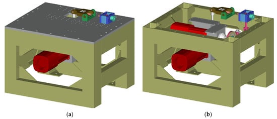 The 3D CAD model of the experimental device for measuring the fatigue characteristics of materials in combined bending and torsion: (a) The model with the top plate steel; (b) The model without the top plate for better visualization of the arrangement.
