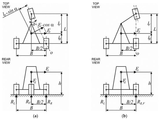 After creating dynamic vehicle models, it became possible to accurately determine the total weight (vehicle + driver = 281.5 kg), inertia parameters, and the position of the center of gravity for precise analytical calculations. Figure 9 visually presents a schematic view of the aforementioned three-wheeled vehicles, featuring two rear wheels, as observed from both top and rear perspectives. The O axis represents the tilt axis of the vehicle during left-hand turns. It is worth noting that the newly designed steering system allows for a flexible configuration of the front wheel. In the most extreme scenario observed in the physical vehicle, depicted in Figure 9b, maximum steering wheel rotation was employed to achieve this configuration. As a result, the vehicle follows a circular path with a radius of 1.5 m.