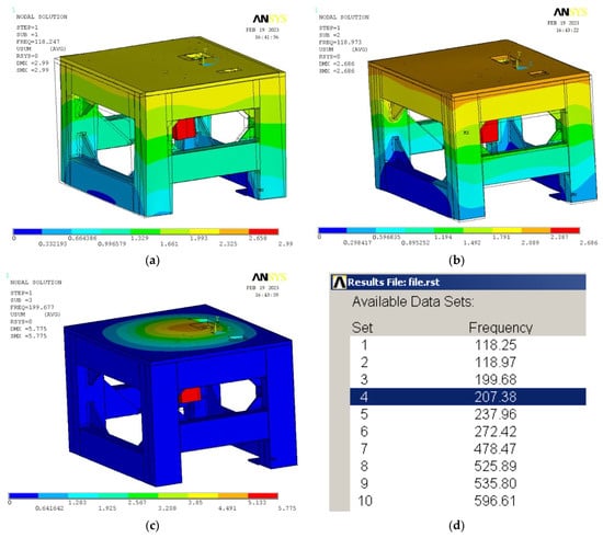 Custom shape of the frame determined by simulation in Ansys software corresponding to: (a) The first natural frequency; (b) The second natural frequency; (c) The third natural frequency; (d) Values of additional natural frequencies.