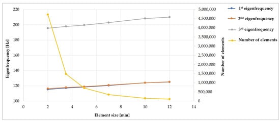 From the point of view of the obtained first three natural frequencies, we reached the following conclusions. In the case of the first natural frequency, the frequency increases when the elements are enlarged. This is 0.95 Hz/mm between 2–5 mm and 0.97 Hz/mm between 5–12 mm. This change is acceptable in the case of such mesh size ranges and constitutes a total increase in natural frequency of approx. 0.83%/1 mm of the mesh, i.e., the difference between 2 mm and 12 mm is an increase of 8.3%. This difference is generally acceptable, considering the deviations caused by the real distribution of the weights of the additional devices and the clamping of the device.