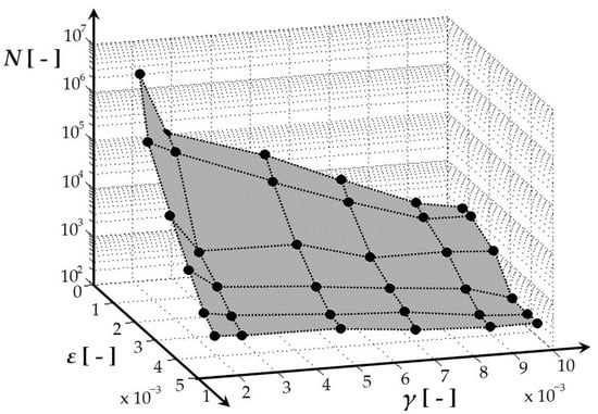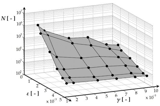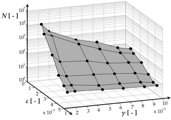 The fatigue life measurement was conducted using the experimental device shown in Figure 3, Figure 6, Figure 7, and Figure 10, following the methodology outlined in [,,,,] and utilizing the parameters specified in Section 2.3. Figure 12 depicts the spatial relationship derived from multiaxial fatigue life measurements, considering the combined effects of bending (deformation ε) and torsion (deformation gamma) at various load levels for the welded material EN AW 6063 (used in the E3-kolka frame). The phase shift between bending and torsional loads was set at φ = 0°. A notable inverse correlation is observed between the decreasing tendency of the number of cycles to fail and the increase in either loading mode. Similarly, Figure 13 presents a comparable graph, highlighting the results of multiaxial fatigue life measurements for the base material EN AW 6063 (used in the E3-kolka frame) under combined bending (deformation epsilon) and torsion (deformation gamma) at different load levels, also with a phase shift of φ = 0°. By comparing Figure 12 and Figure 13, it becomes apparent that lower deformation amplitudes result in slightly higher fatigue life for the welded material. Detailed numerical measurement values were published in [].