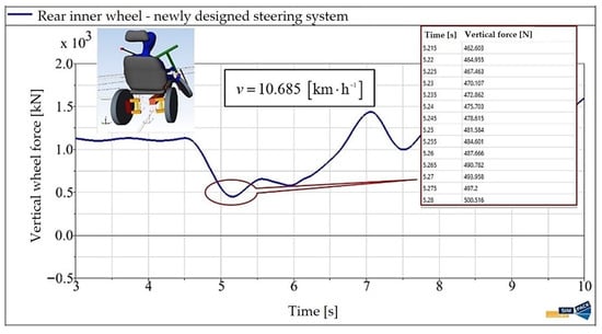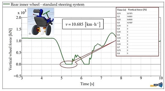 The article [] analyzed the maximum vehicle speed analytically as a function of the curve radius. This section presents the results obtained for the same configurations using numerical simulation in the SIMPACK program. The numerical analysis outputs are presented in Figure 16 and Figure 17. These figures illustrate the simulation results for a three-wheeled vehicle with standard steering (Figure 16) and the E3-kolka (Figure 17). Additionally, the figures provide visual representations and values of the vertical wheel forces at the contact patch in the curve for the unladen wheel and the road surface.