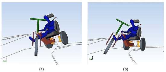 Figure 18 presents the simulation results for the driving stability of both a three-wheeled vehicle with standard steering (Figure 18a) and the E3-kolka (Figure 18b) in the graphical interface of the SIMPACK program. Analyzing the numerical data obtained from Figure 16, Figure 17, and Figure 18, it is evident that when driving at the identical velocity of v = 10.685 km/h through a curve with a radius of Rz = 1.5 m, the three-wheeled vehicle equipped with standard steering loses stability and experiences rollover. However, E3-kolka maintains continuous contact between its rear inner wheel and the road surface.