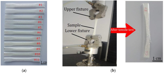 (a) Final products (3D-printed object made with PVA material). (b) The samples during and after tensile testing.