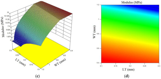 In Figure 2, the output graphs generated by the “Design Expert” software for the printed sample’s MTS are displayed. Figure 2a represents the normal plot of residuals for the MTS, showing that the residuals align closely with the trend line, indicating the conformity of the DOE for this output. Figure 2b, which is the perturbation plot for the MTS, examines the simultaneous effects of two parameters, WT and LT, on the MTS of the samples. Figure 2c presents the surface plot for the MTS of the samples. Based on this plot and the 2D contour plot of the MTS (Figure 2d), it can be observed that the MTS increases with a decrease in the WT of the printer. This is because reducing the WT results in thinner printed layers, leading to better filament consolidation in the samples. Increased consolidation of the printed layers requires more force to separate the samples, ultimately resulting in an increase in the MTS. Furthermore, considering the red regions in Figure 2d, the MTS of the samples is maximized when the WT parameter is set to a lower value for the printer. This is because decreasing the WT increases the print density and filament consumption, which leads to an increase in the MTS of the samples.