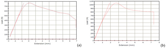 (a) Load (N) vs. Extension (mm) of Sample 1 (b) Load (N) vs Extension (mm) of Sample 2.
