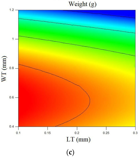 In ANOVA, Table 5, the designed model for the weight of the samples after 3D printing is presented. In this model, the effects of the input parameters on the weight of the samples, as well as the second-order effects of WT, are analyzed. Based on the p-values, the effects of the parameters and the experimental model are found to be significant. Considering ANOVA, Table 5, and the coefficients Equation (2), it can be concluded that the effects of the WT parameter on the weight of the printed samples are greater compared to the effects of the LT parameter.